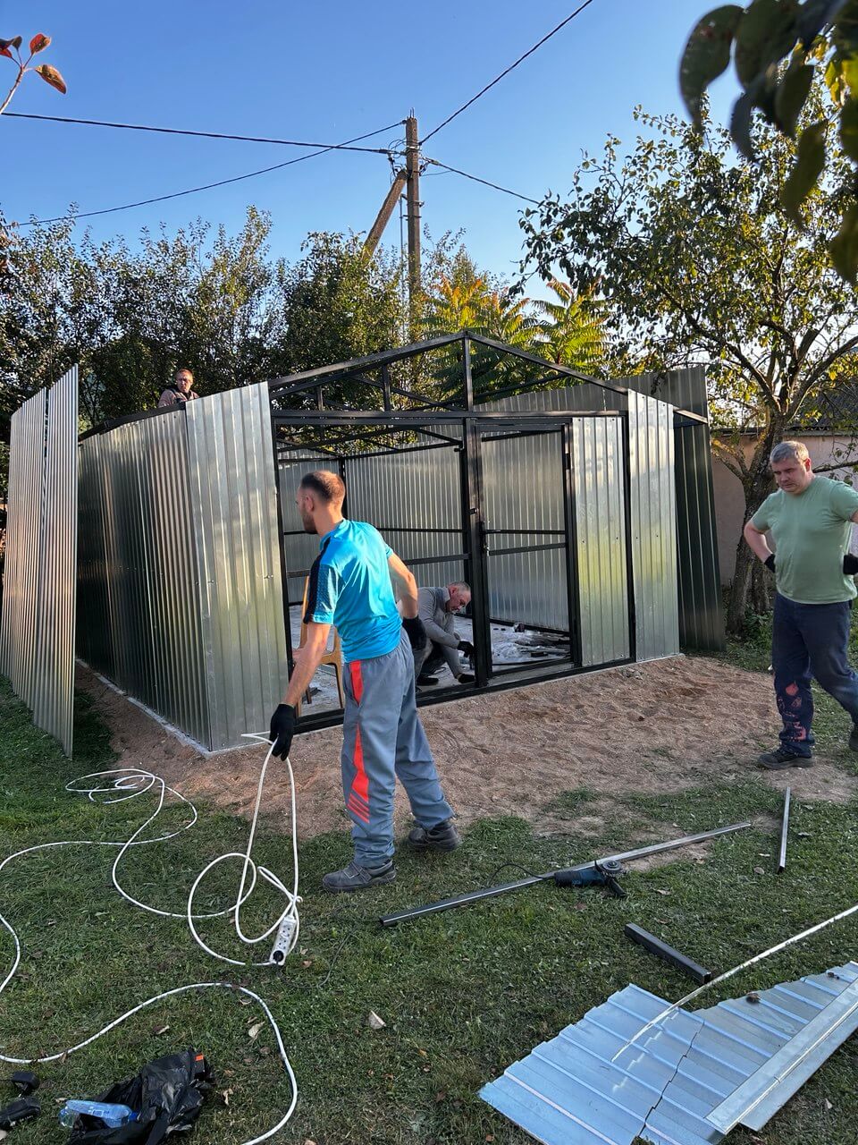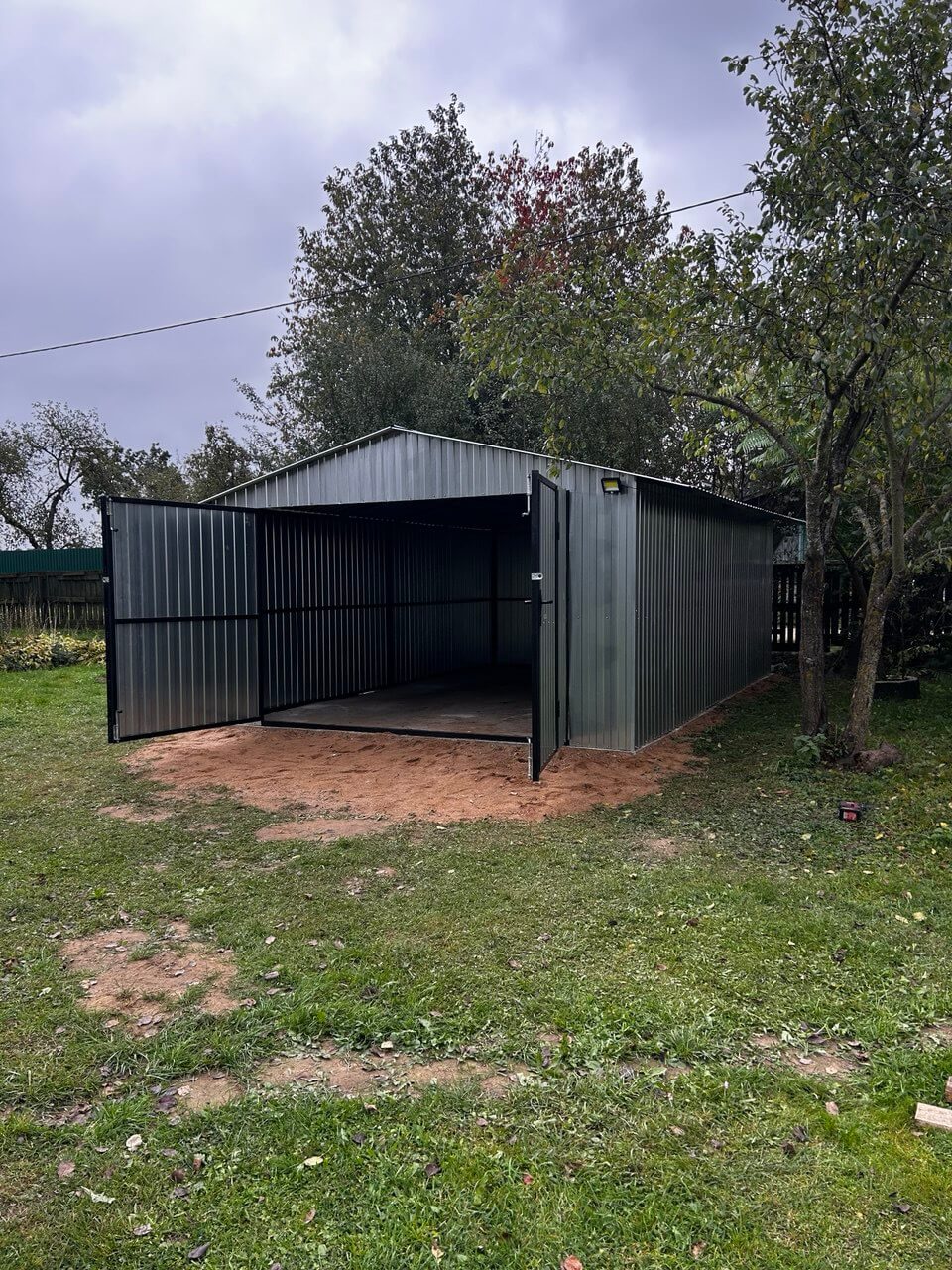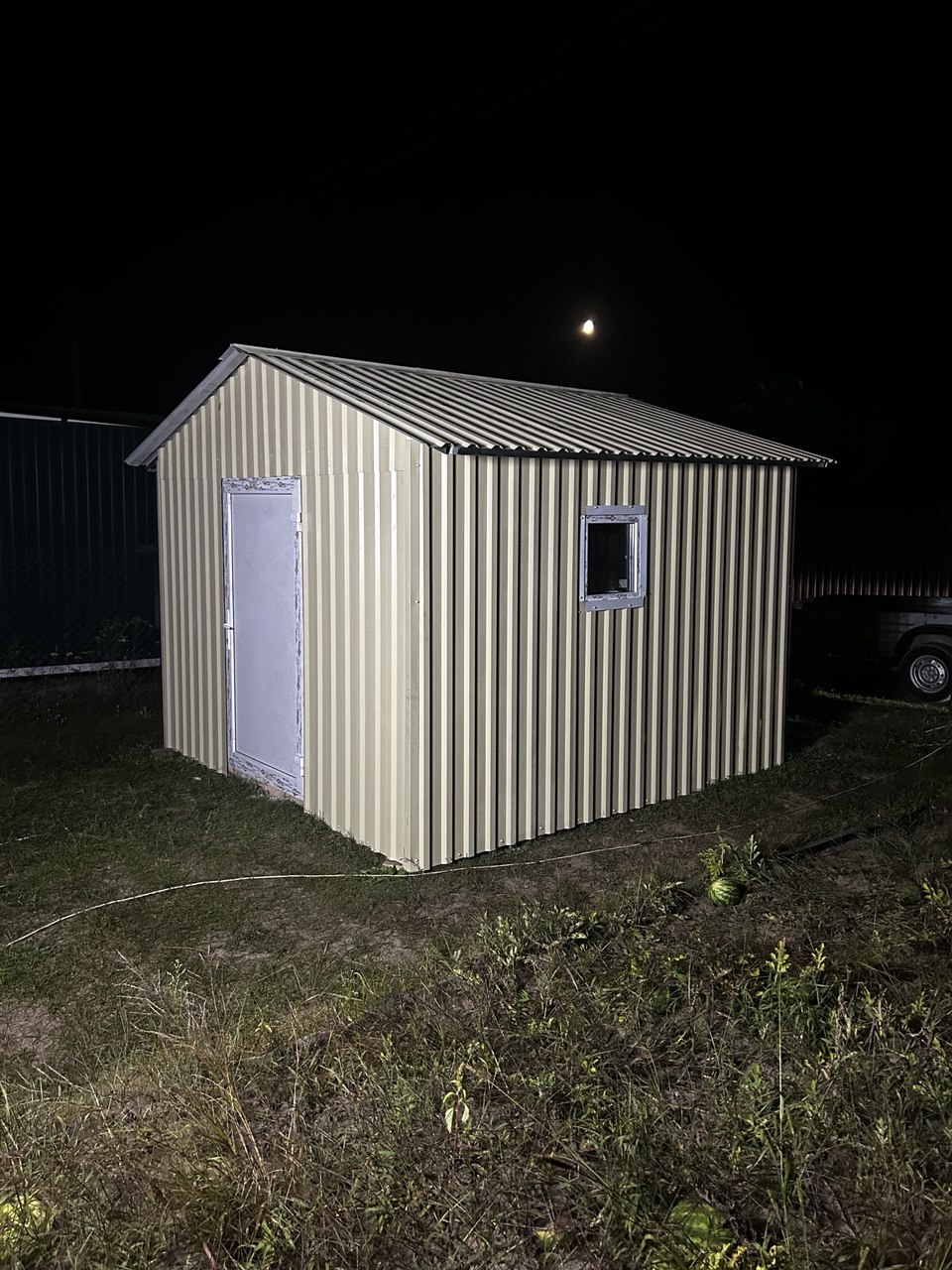Каркас 40х40х20. Оцинковка. Профлист окрашен либо нет по желанию заказчика. Двери и окна ПВХ.